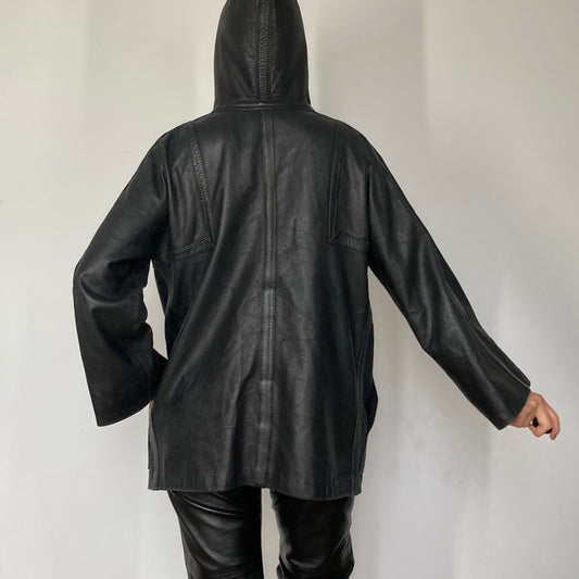 Vintage Woman black Leather parka Jacket with hood
