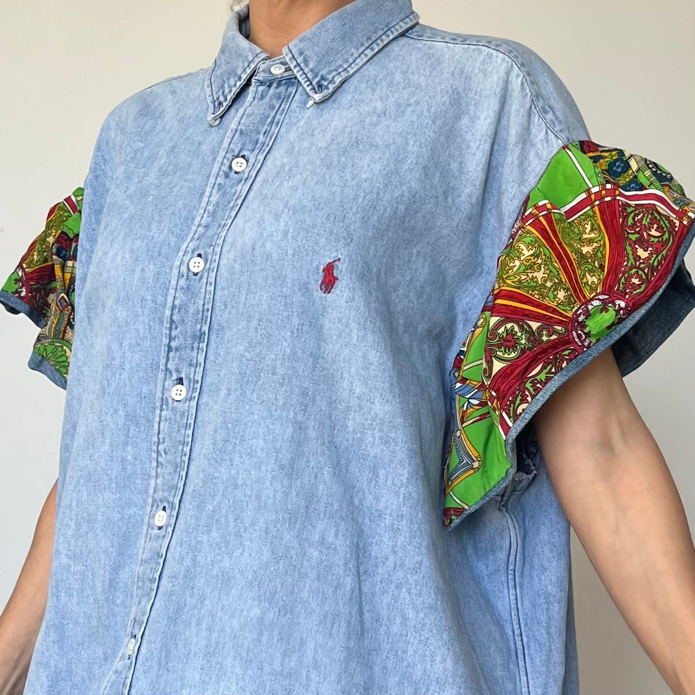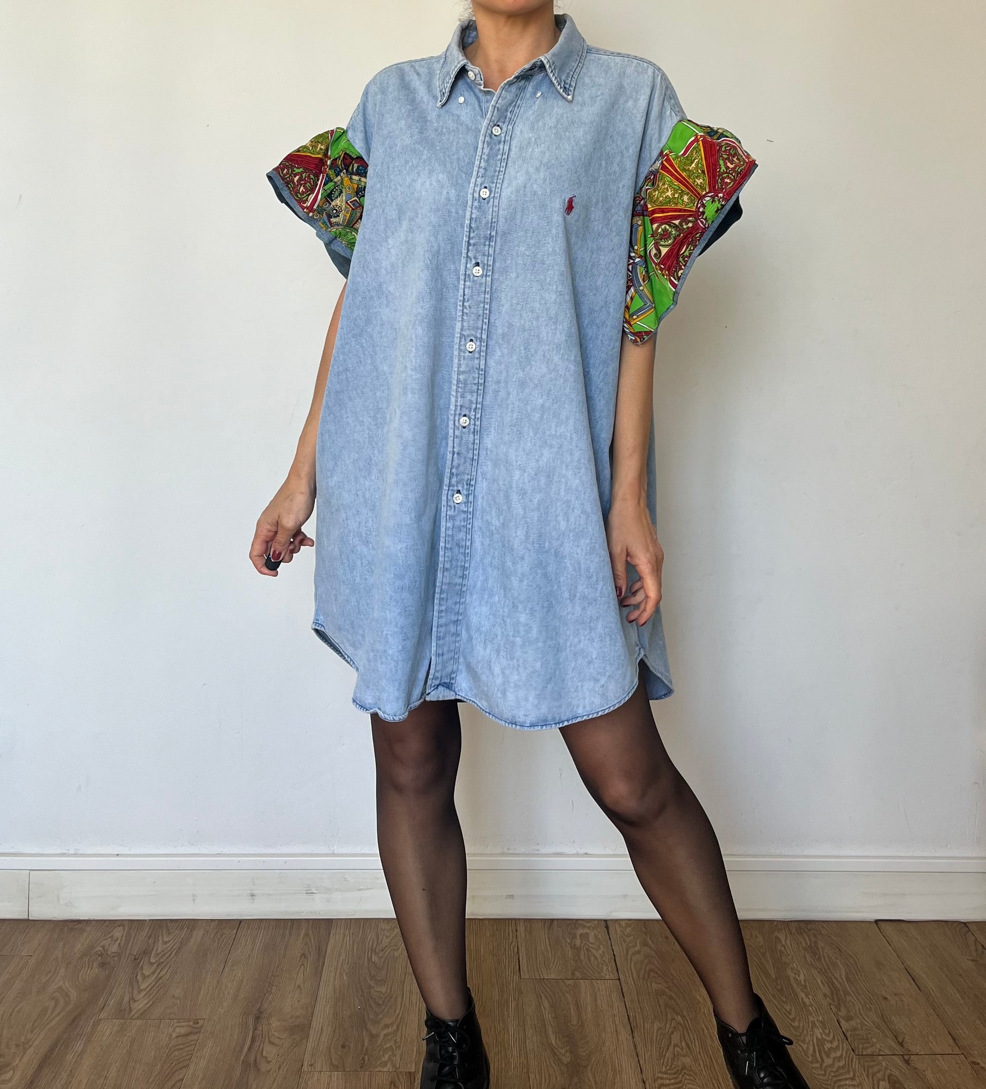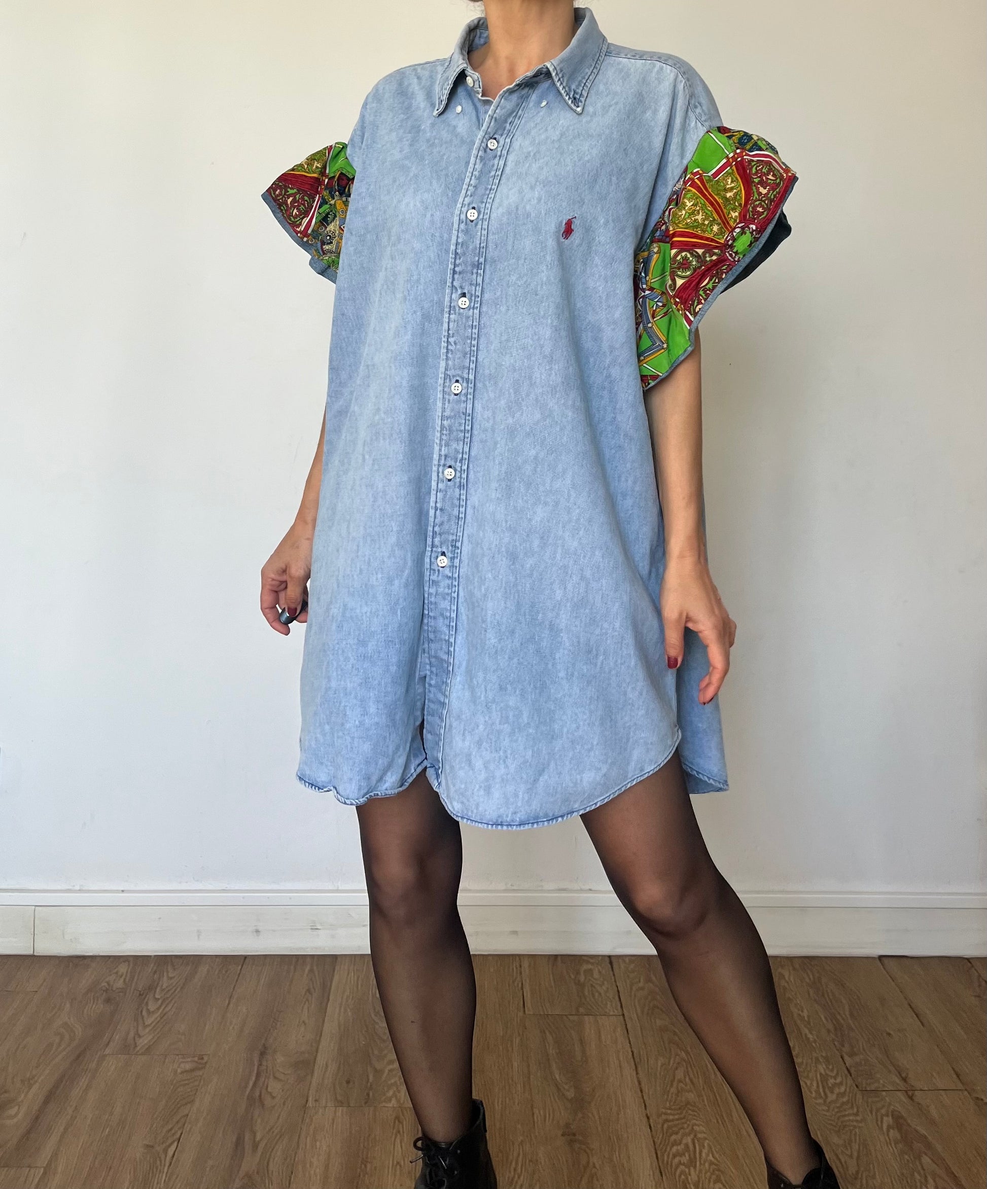 This vintage Ralph Lauren denim shirt dress features a unique design