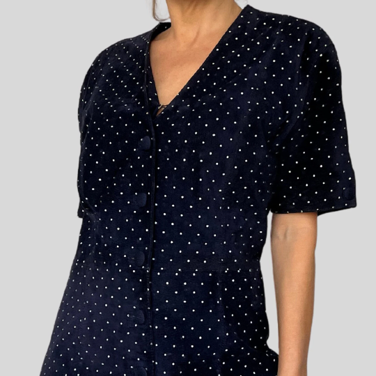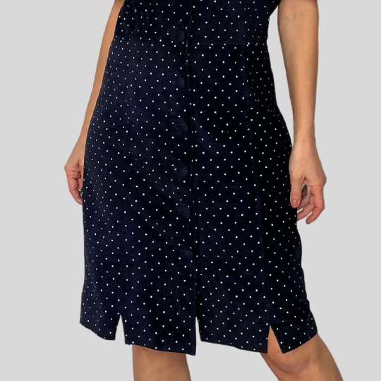 A beautiful suede cloth in midnight blue with delicate white polka dots.