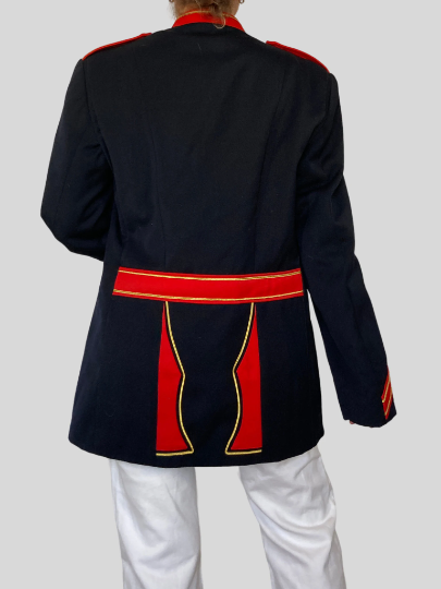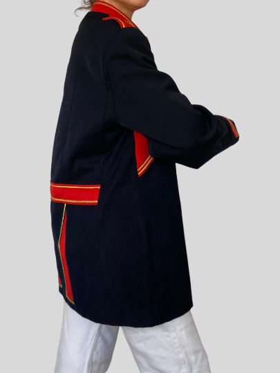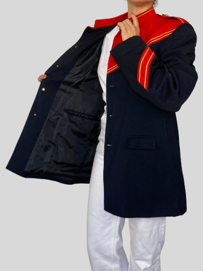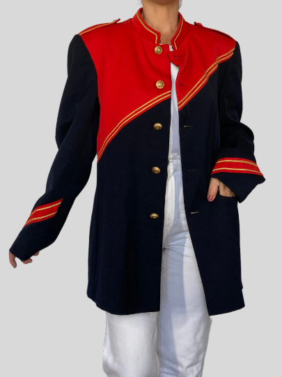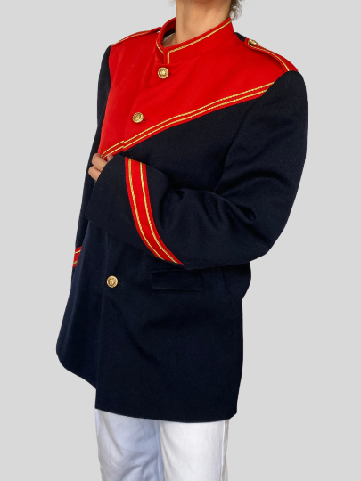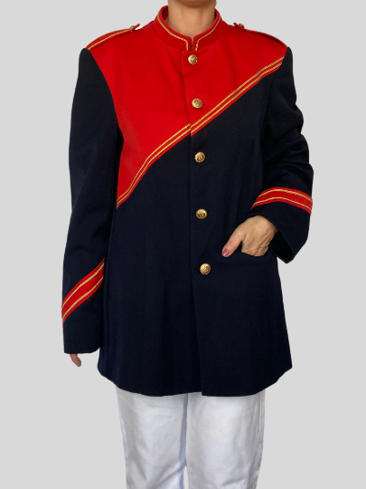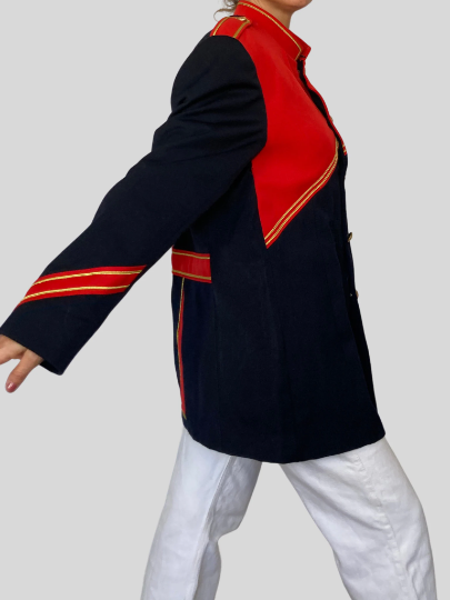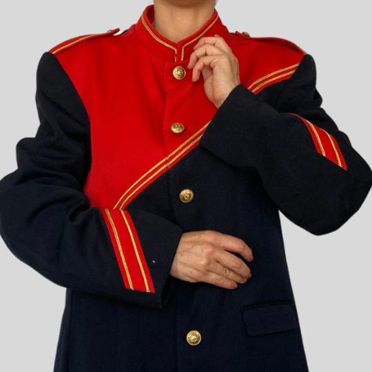 This blazer in blue and red color has a beautiful uniform style.