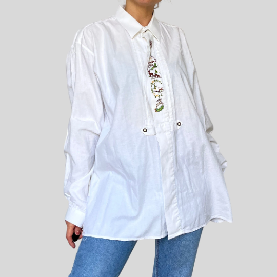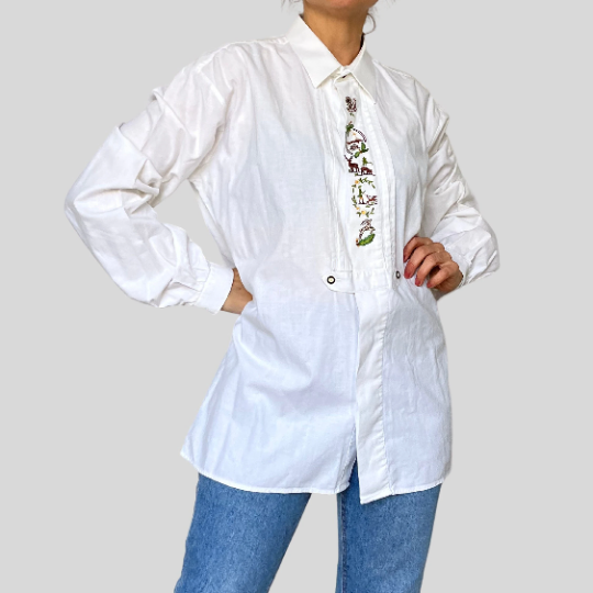 A beautiful folk style white blouse with embroidery on the jabot.