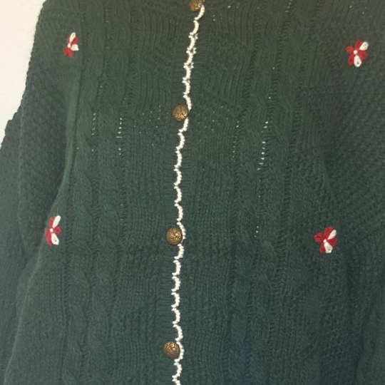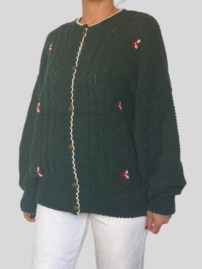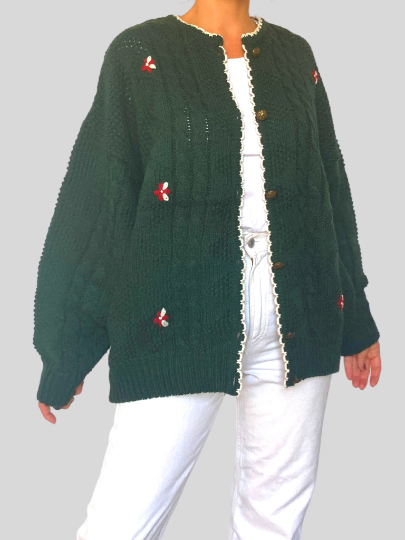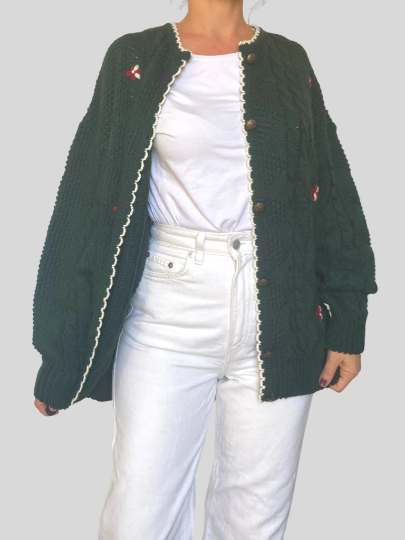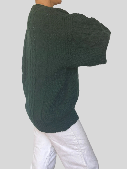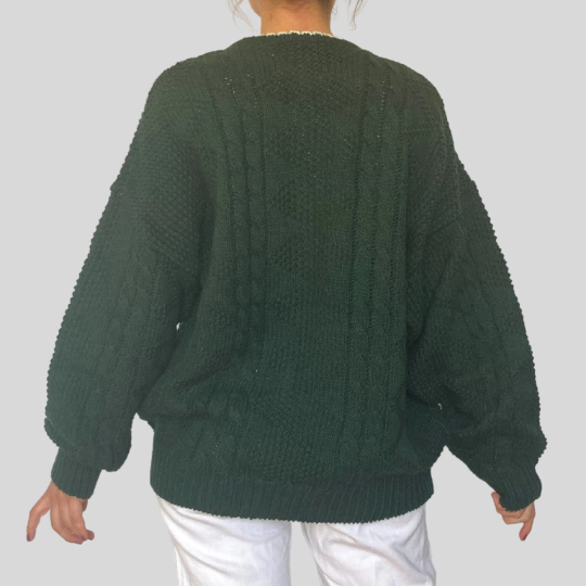 Vintage green knitted cardigan with a design of braids and geometric figures in the fabric.