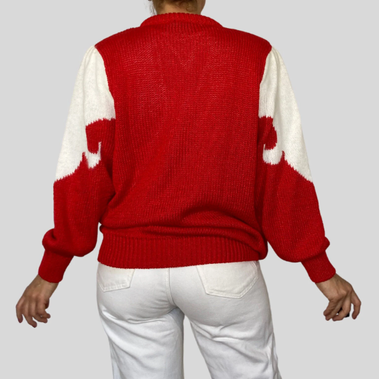Vintage red and white knitted sweater with wave design and fantasy details.