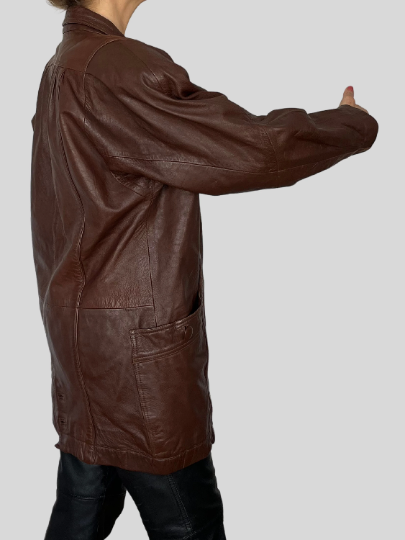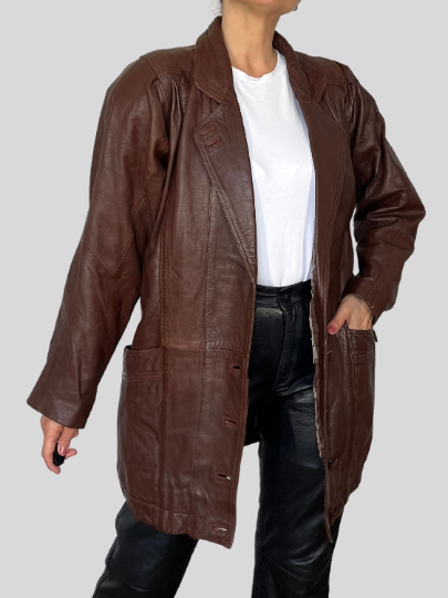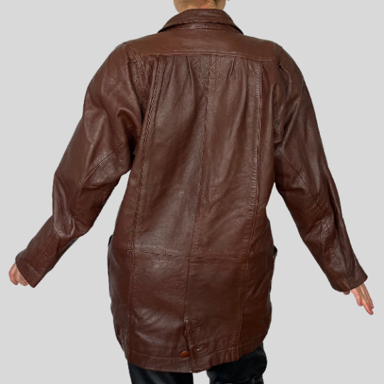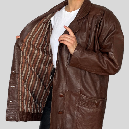Long coat above the knee, with a wide view and leather-covered buttons.