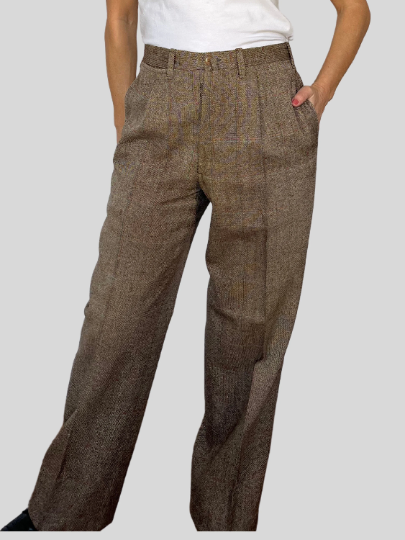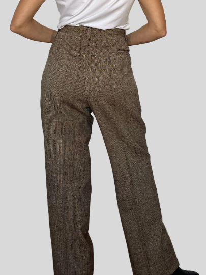 the pants have a high waist, darts and a wide cuff