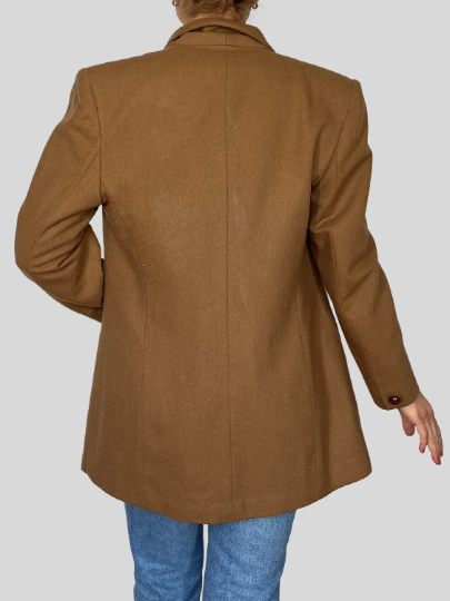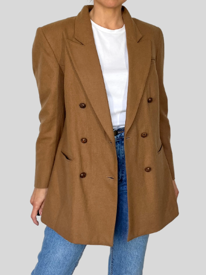 The jacket is wide, with 3 front pockets and fastens with buttons