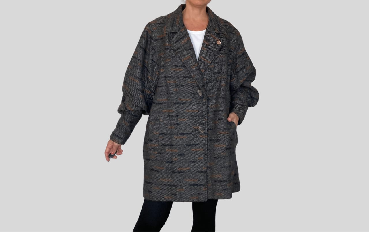 It is an oversized marbled style maxi jacket in gray, black and beige.