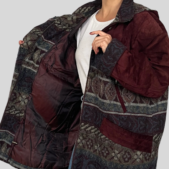 The coat is made of suede combined with printed in ethnic guards.