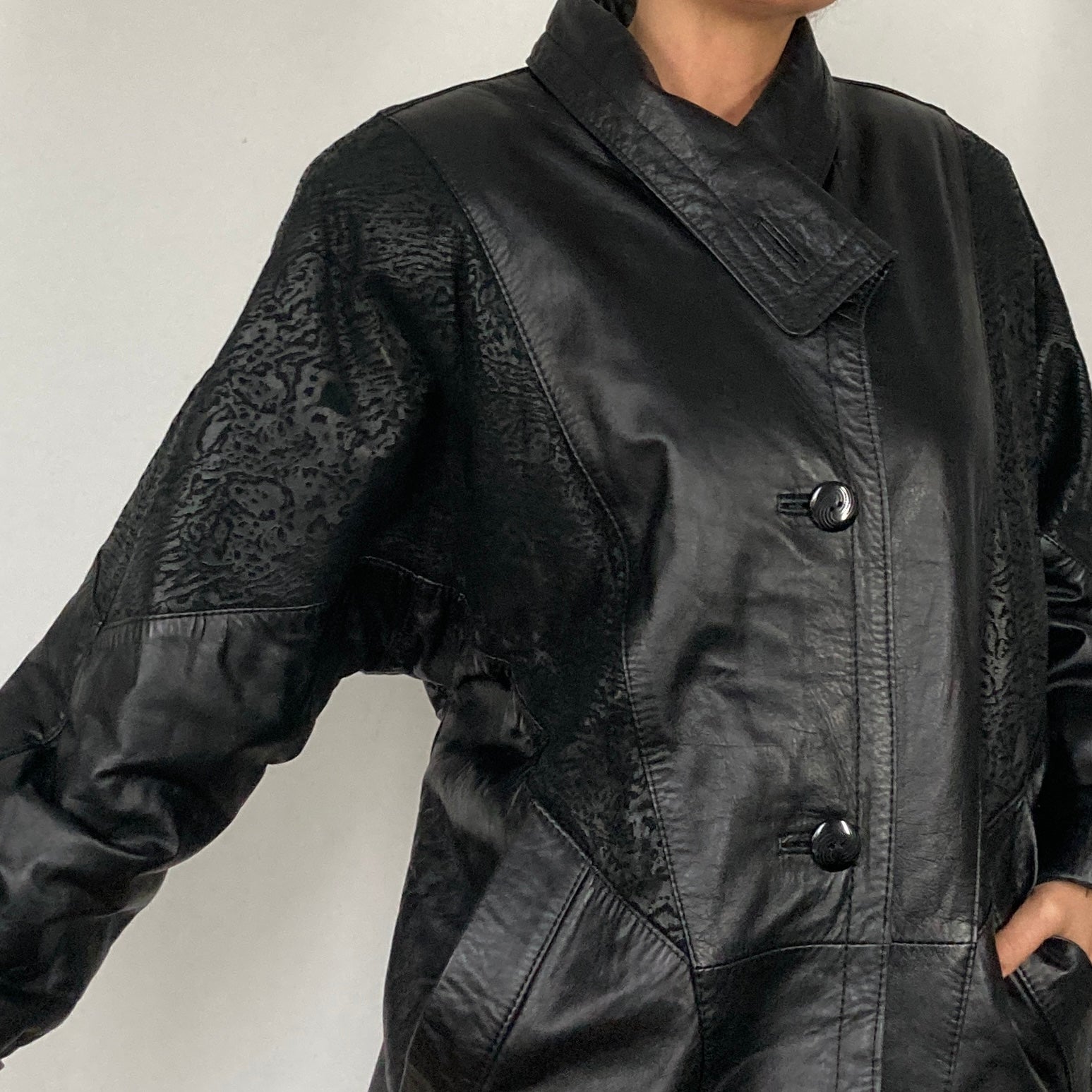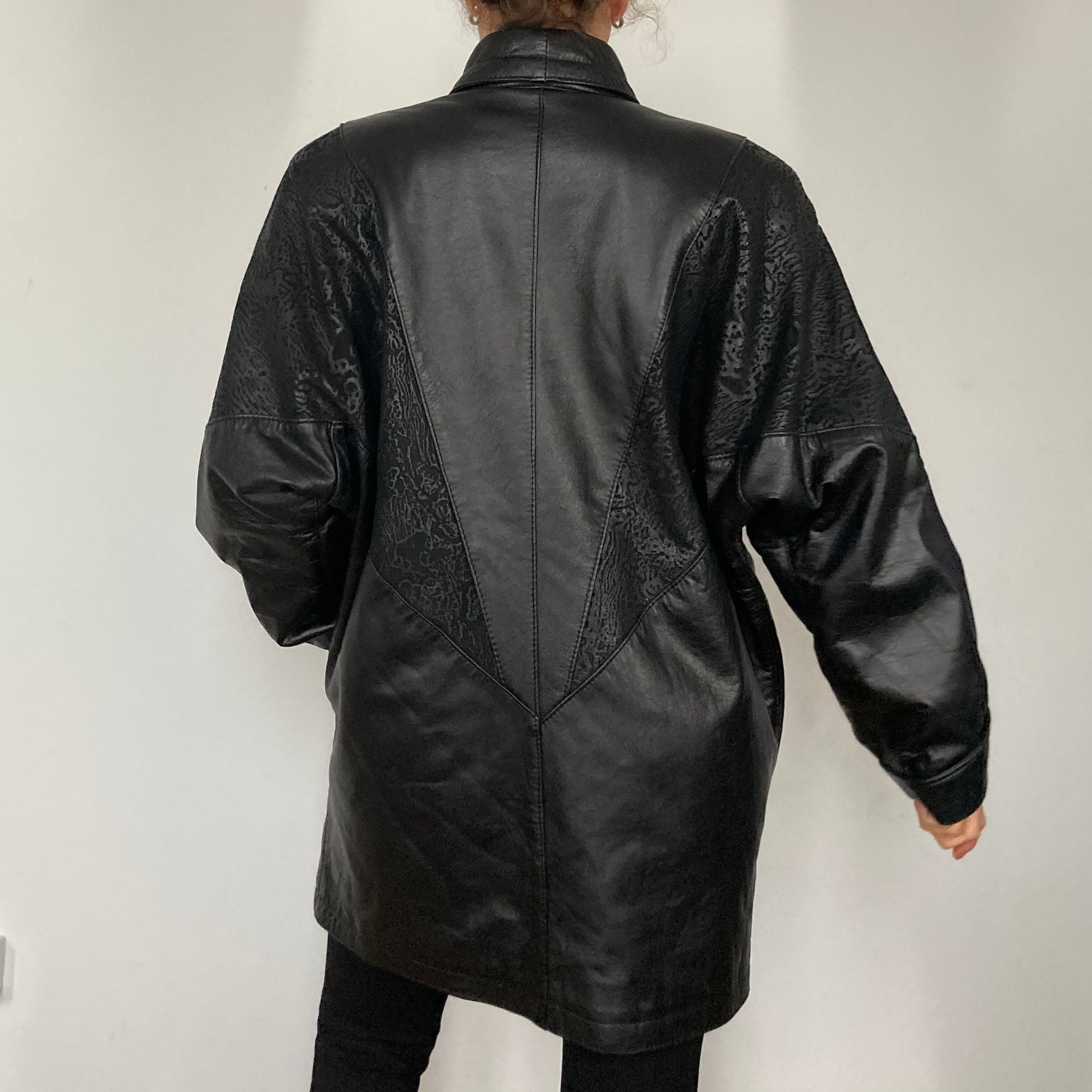 This beautiful and soft black leather jacket has shoulder pads and