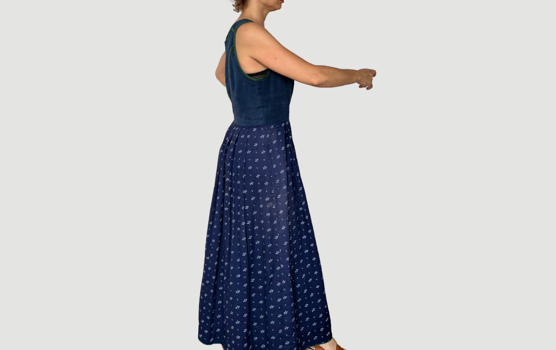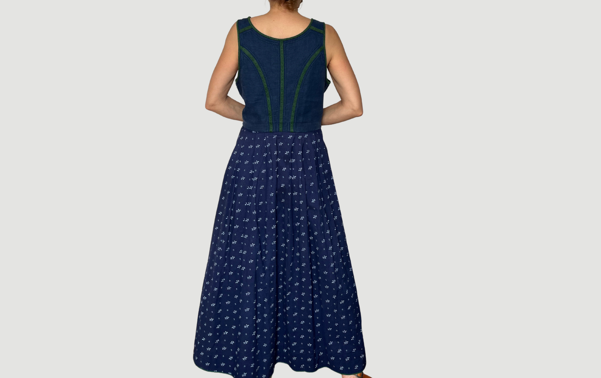 Austrian style vintage dress made from a blue bib with green trim,