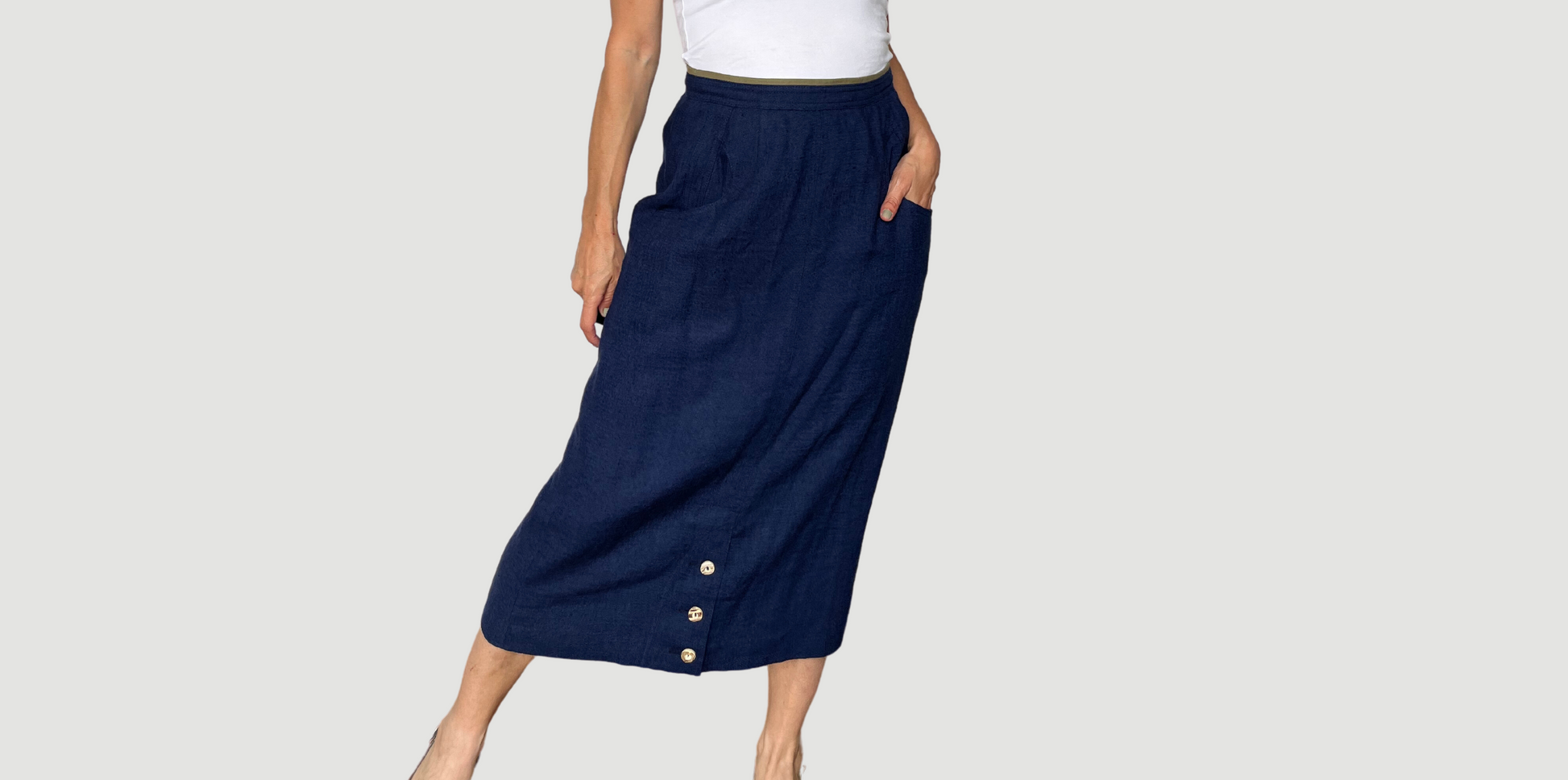 The skirt is high waisted, with a green trim at the end of the waist, in combination with the jacket. It has front pockets and zip and button closure.