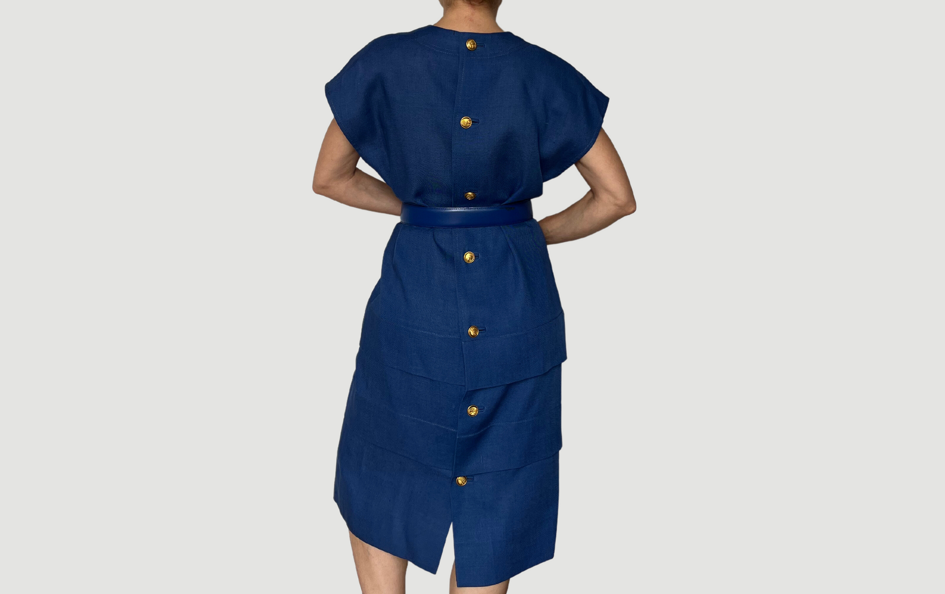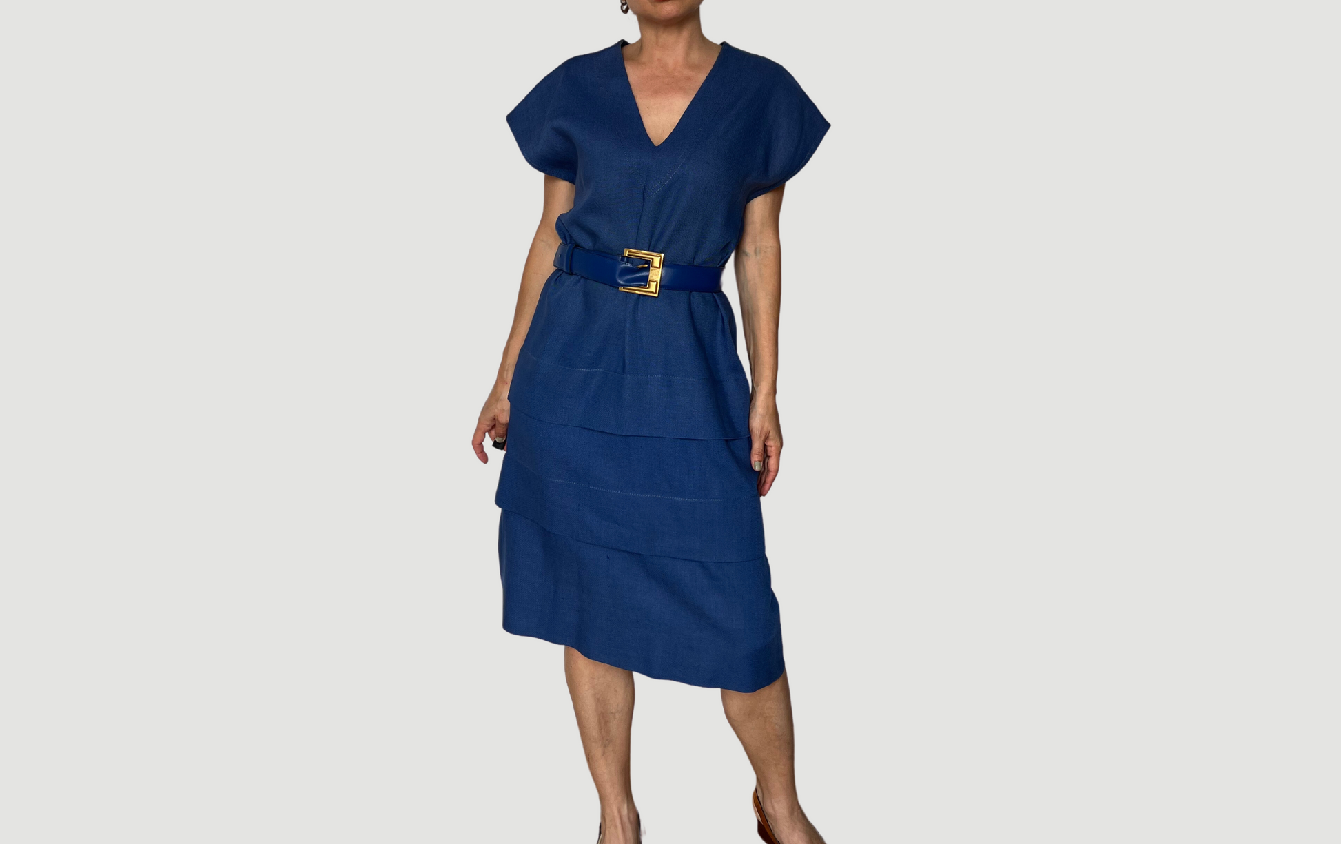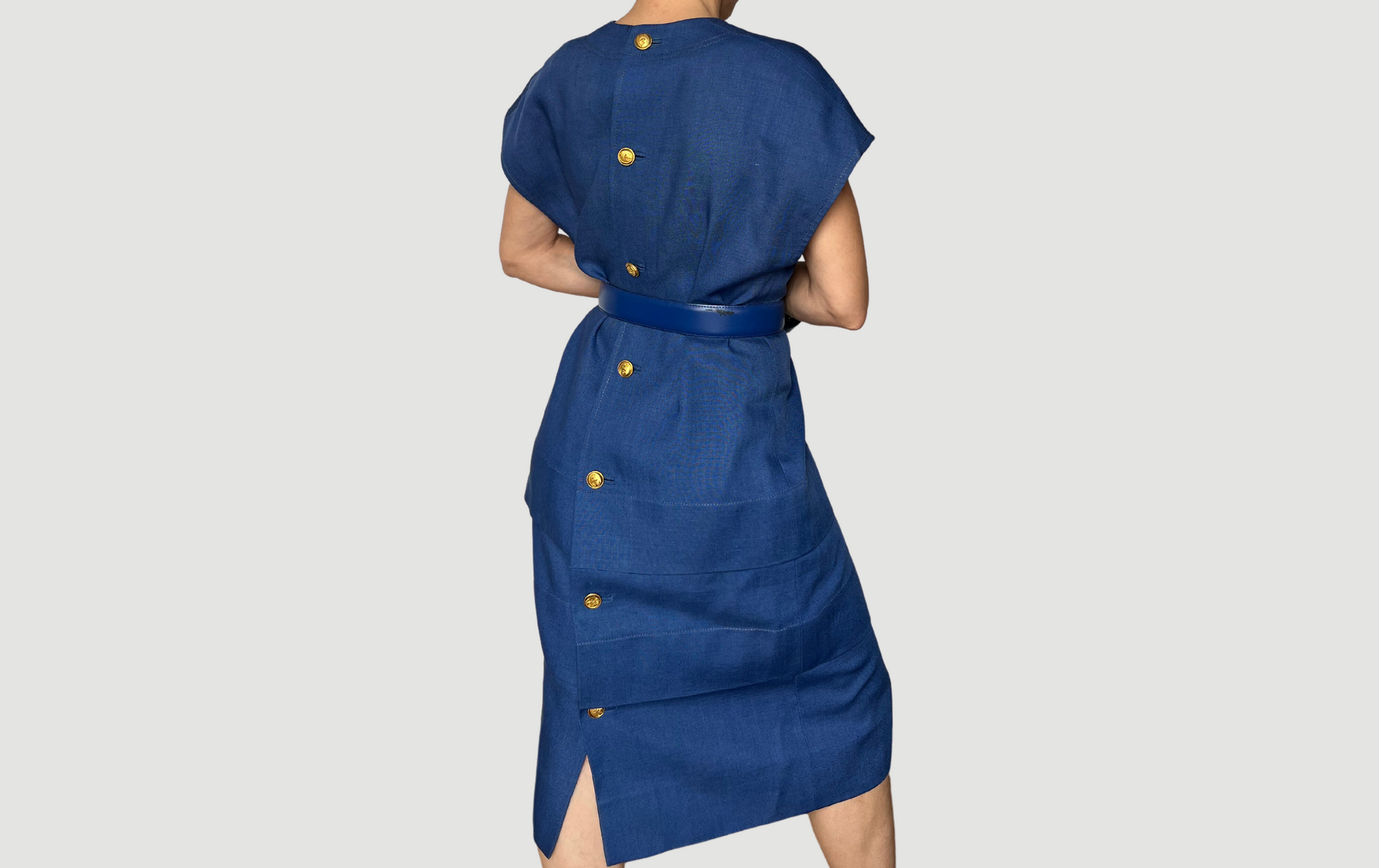 Beautiful Vintage Women Blue thick linen fabric Dress