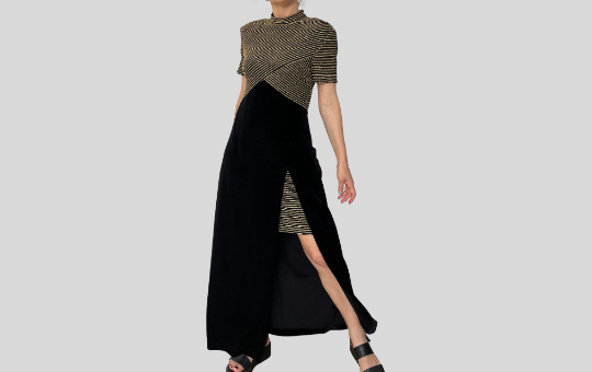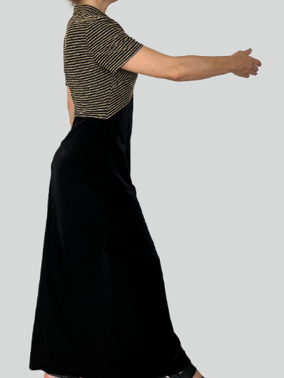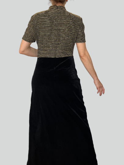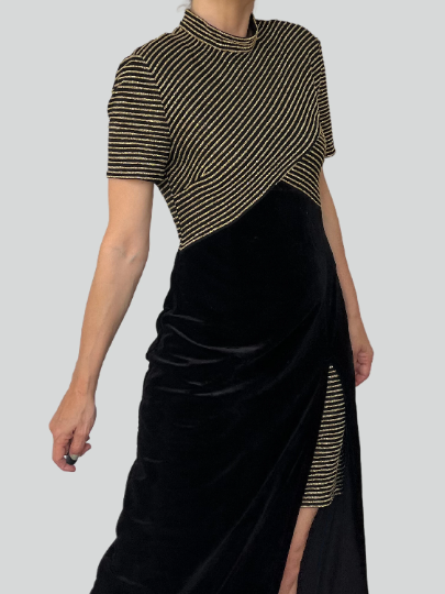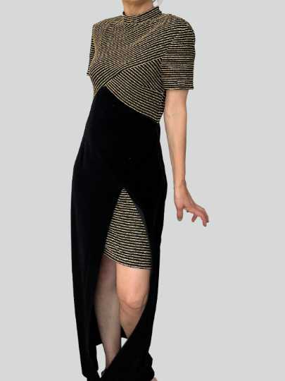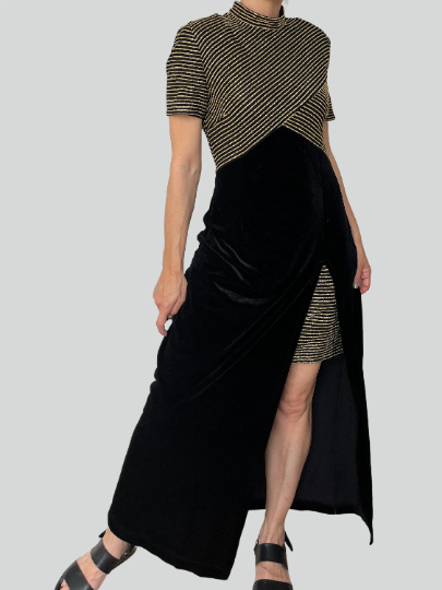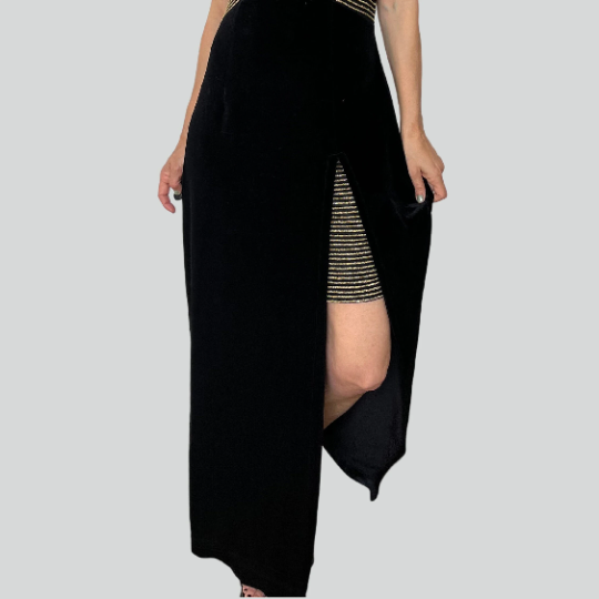 in gold with glitter and a black velvet overskirt with an impressive cut.