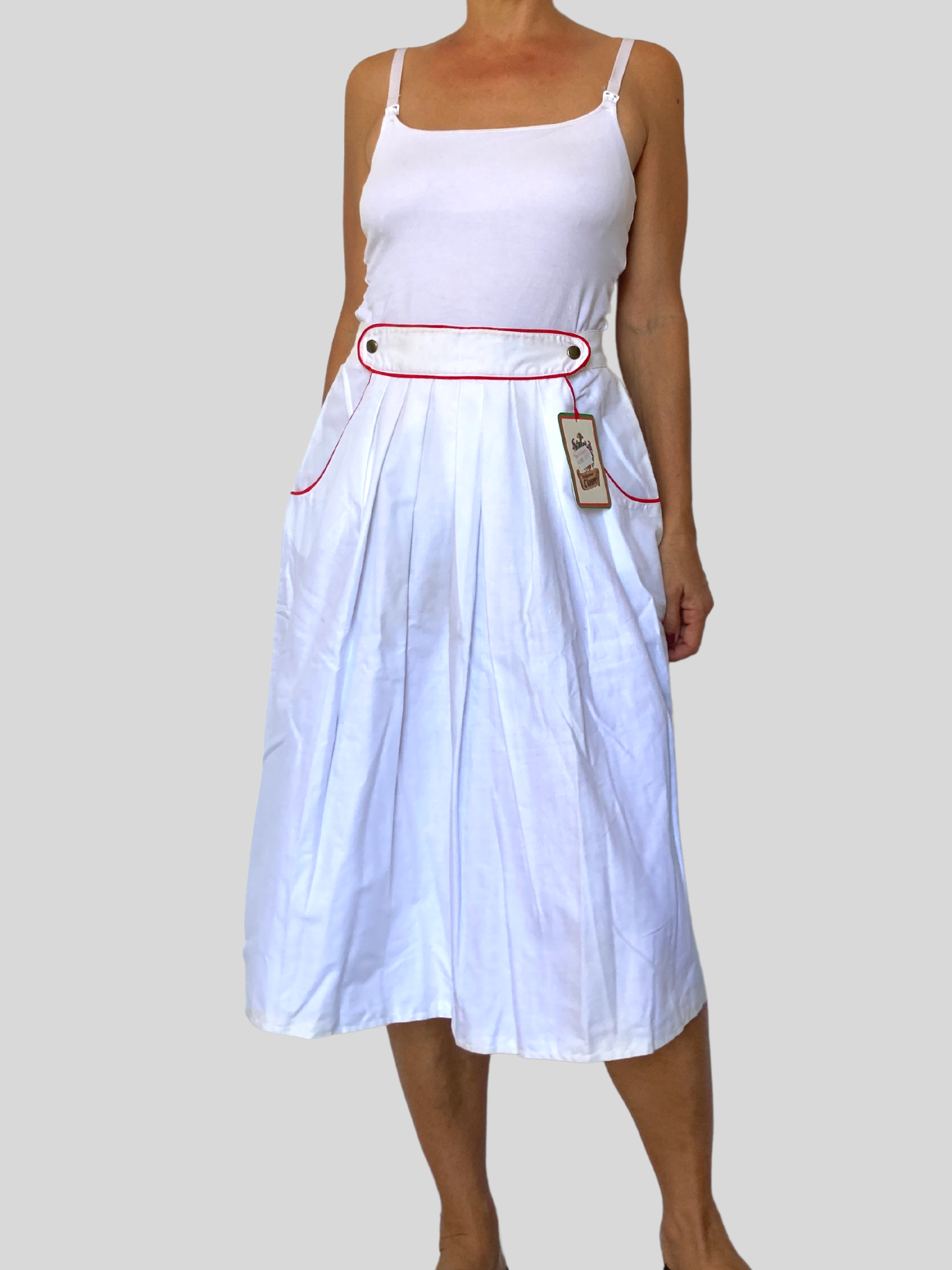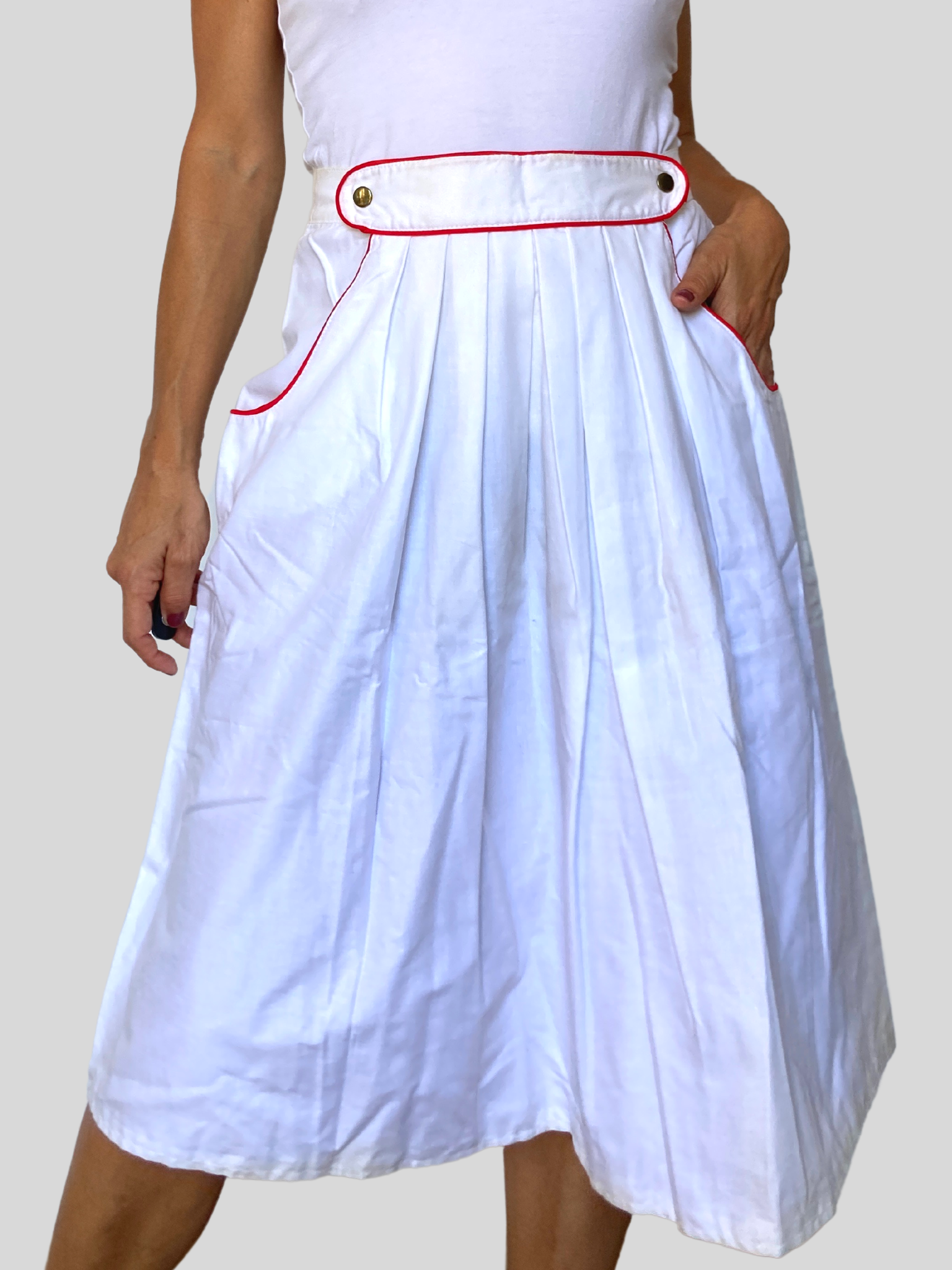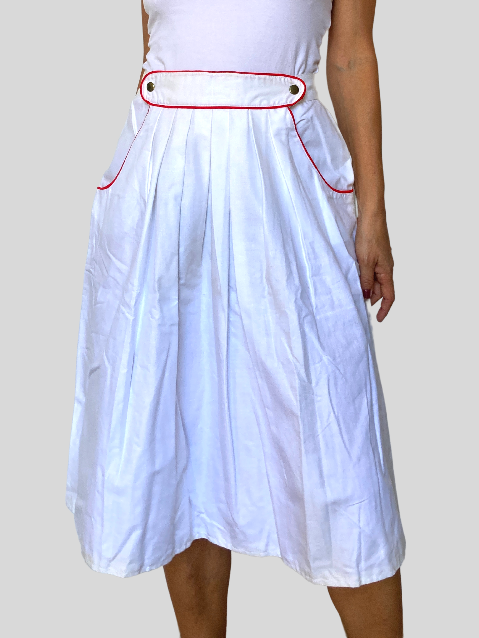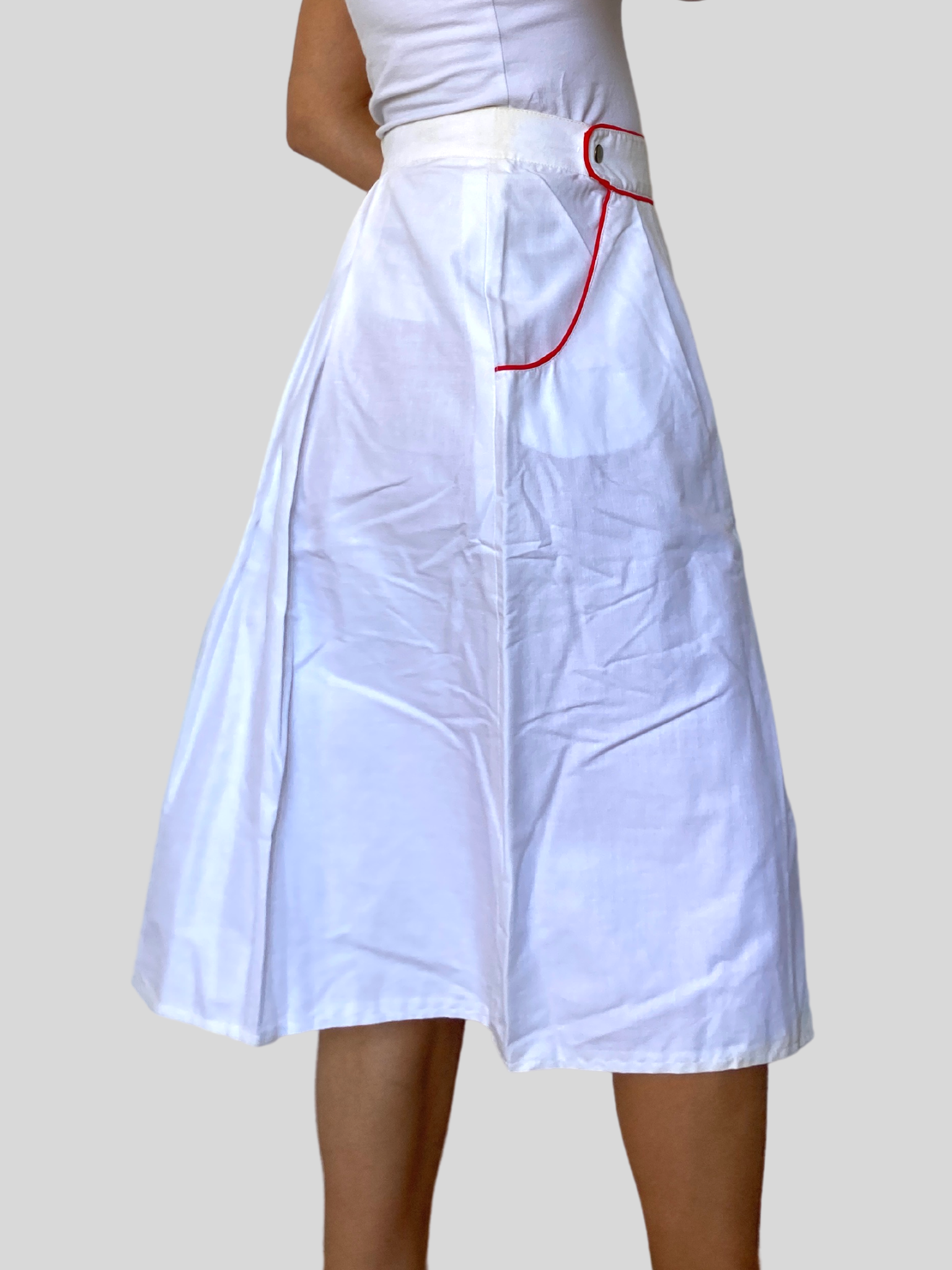 Made of cotton, this white midi skirt is enhanced with red piping.