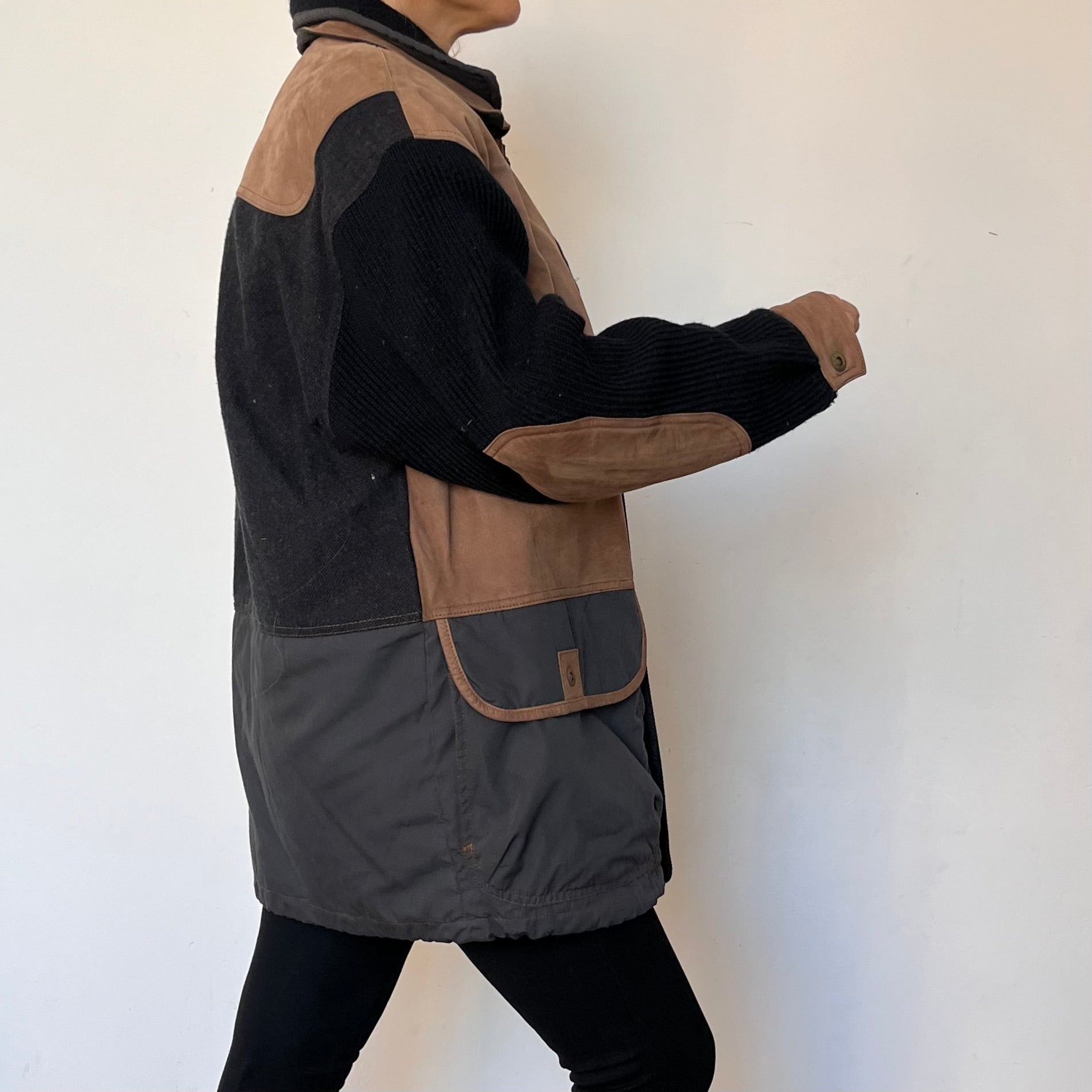 with ribbed black knit sleeves and a dark cotton–polyester body,