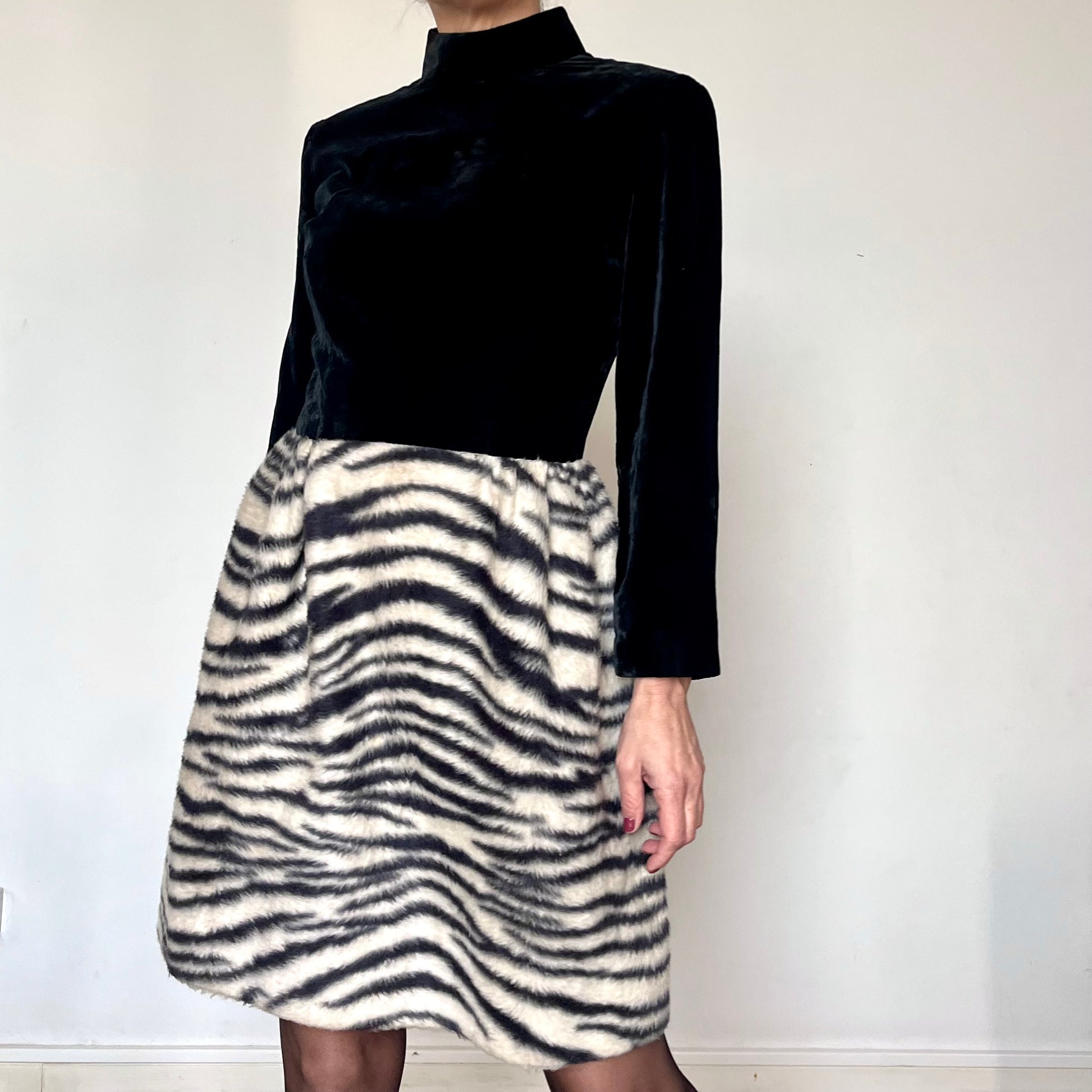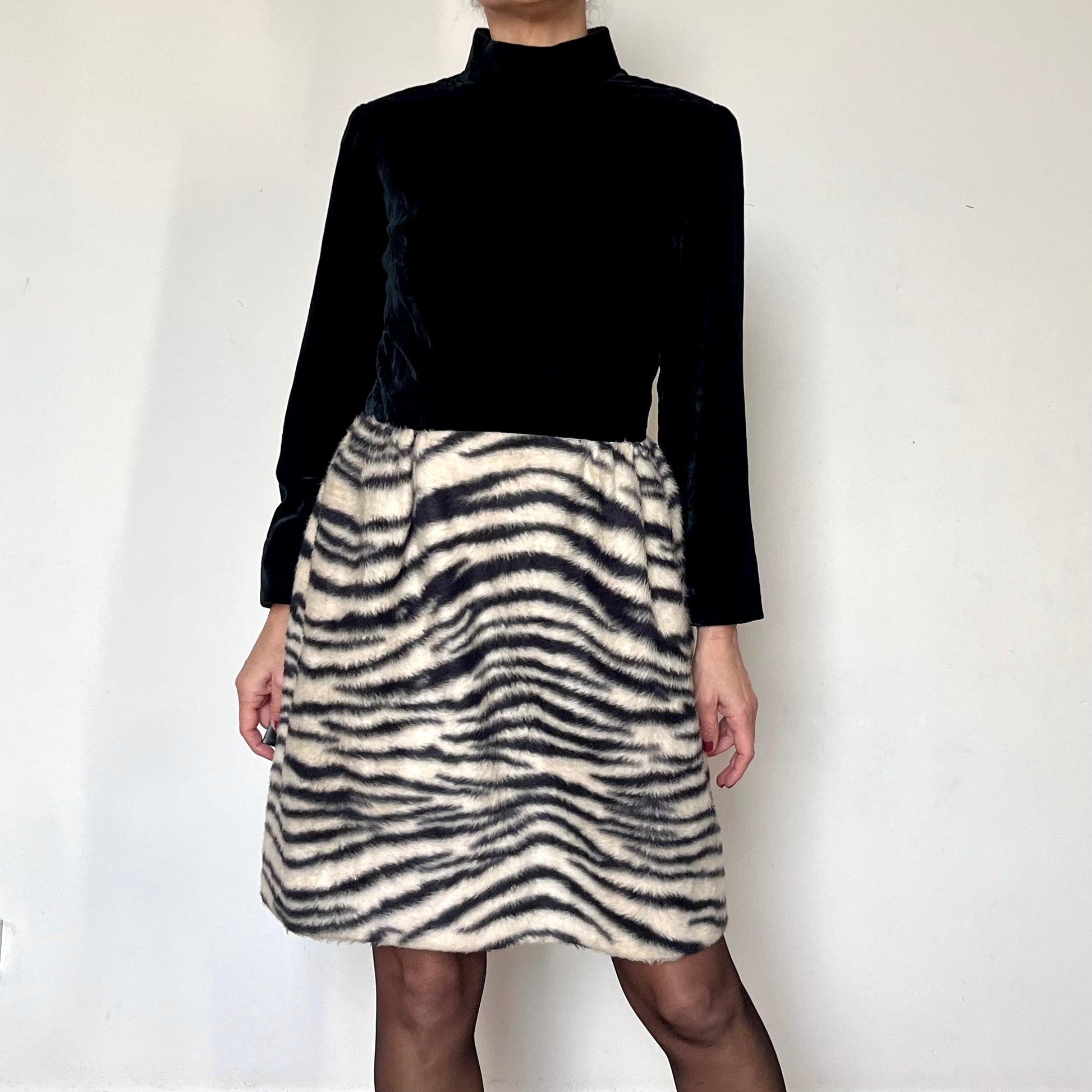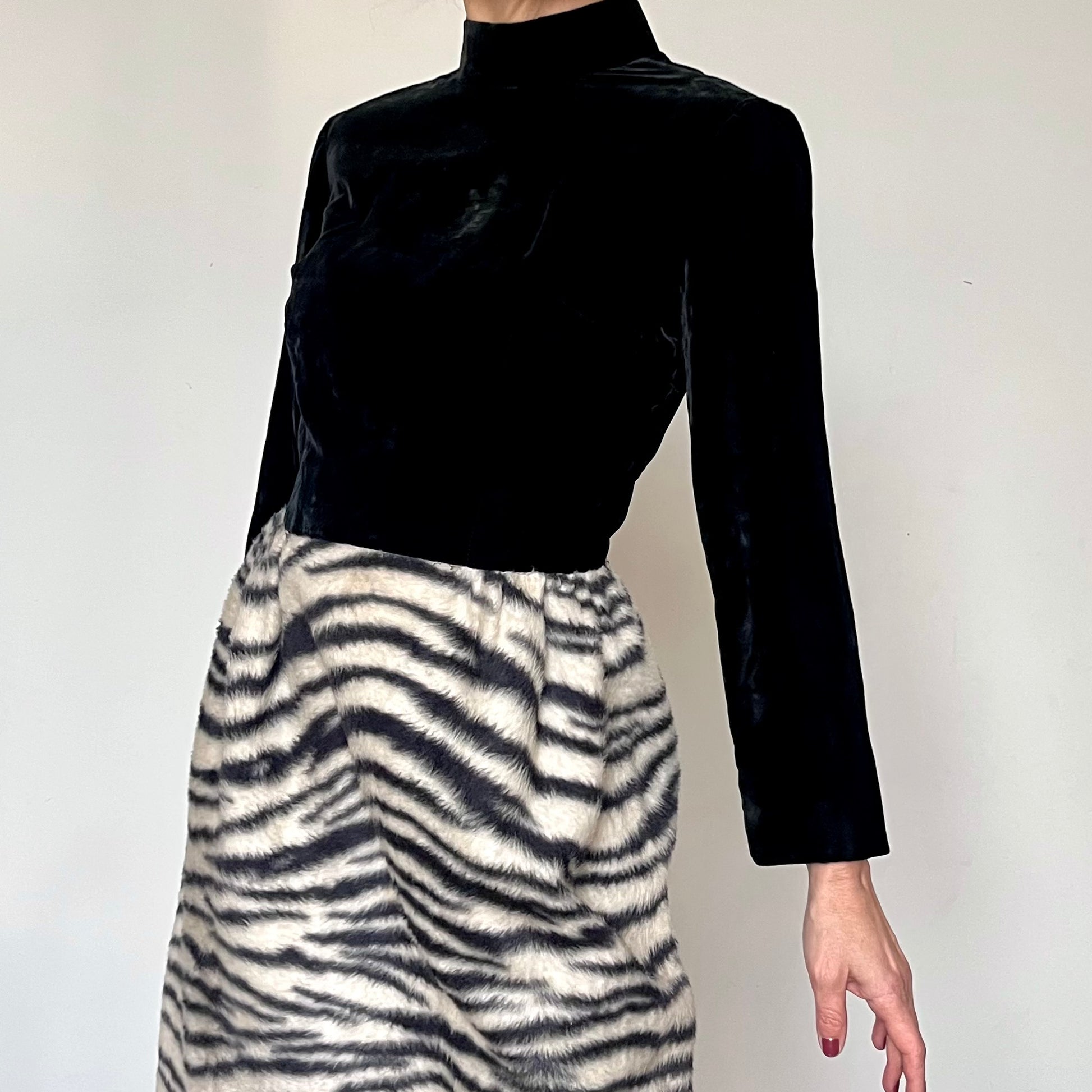 This eye-catching piece features long sleeves and a bold zebra print skirt