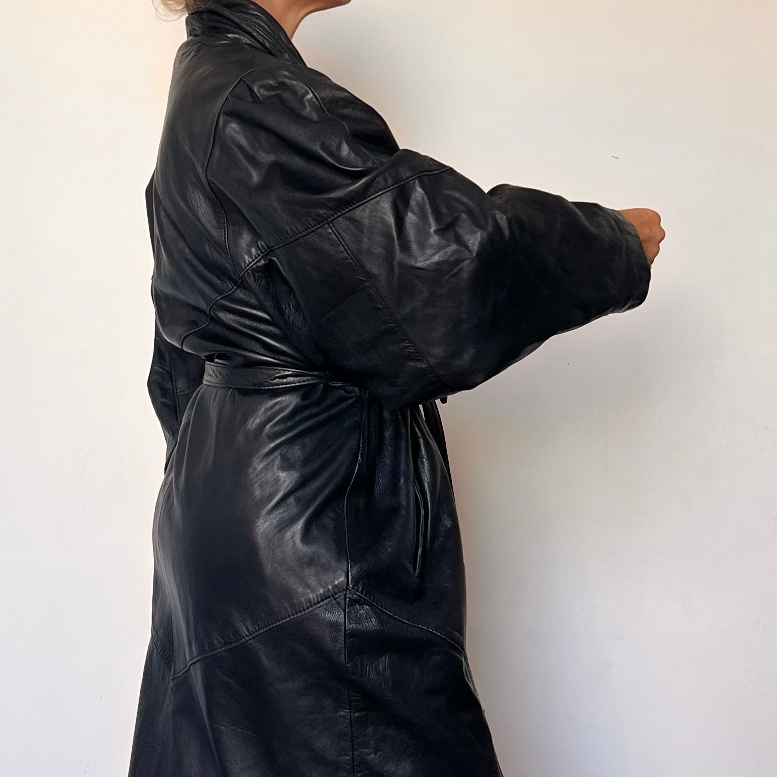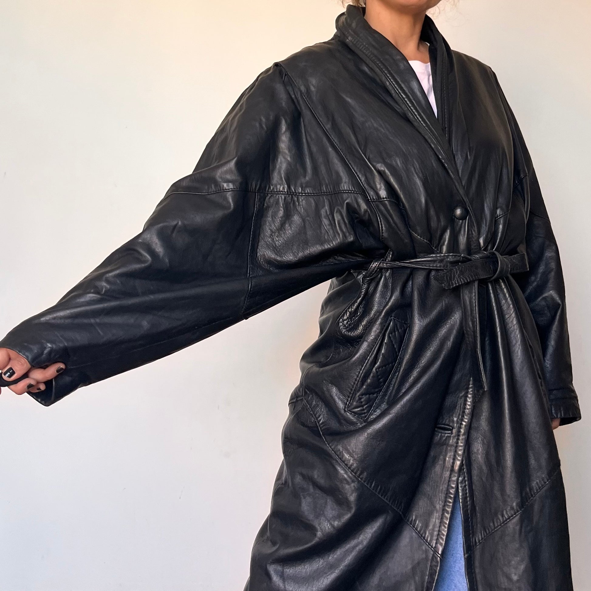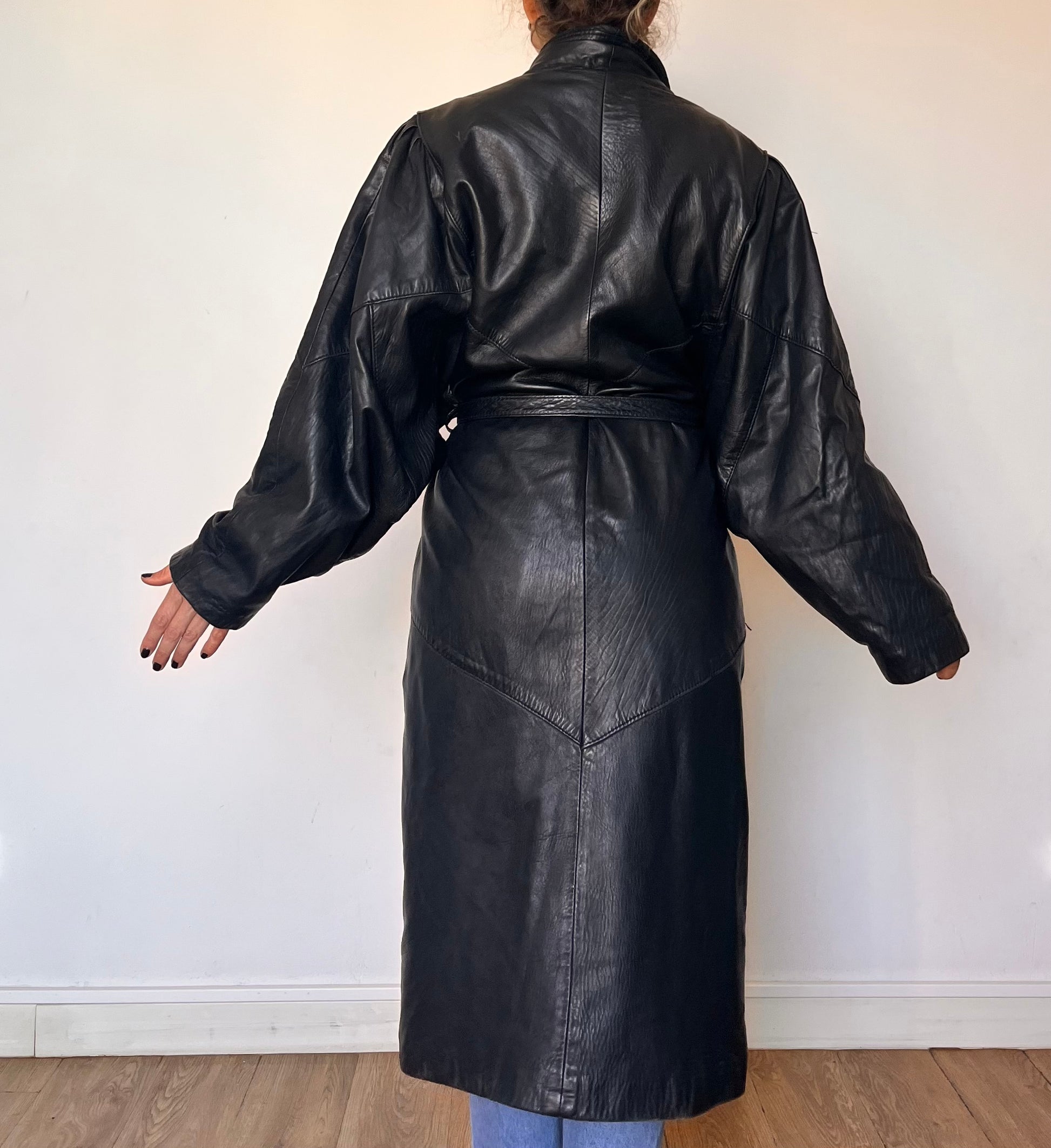 Incredible black leather overcoat with a unique design