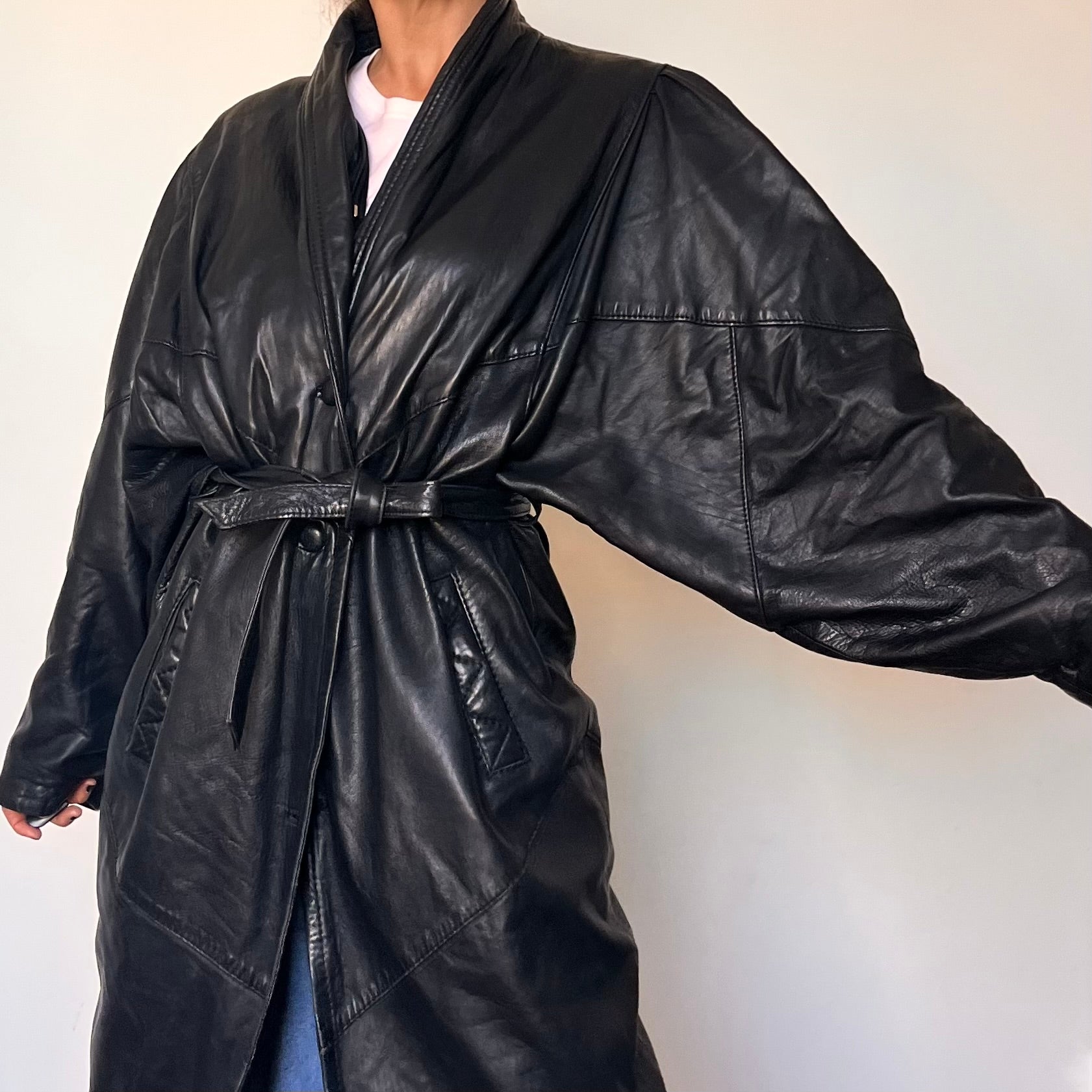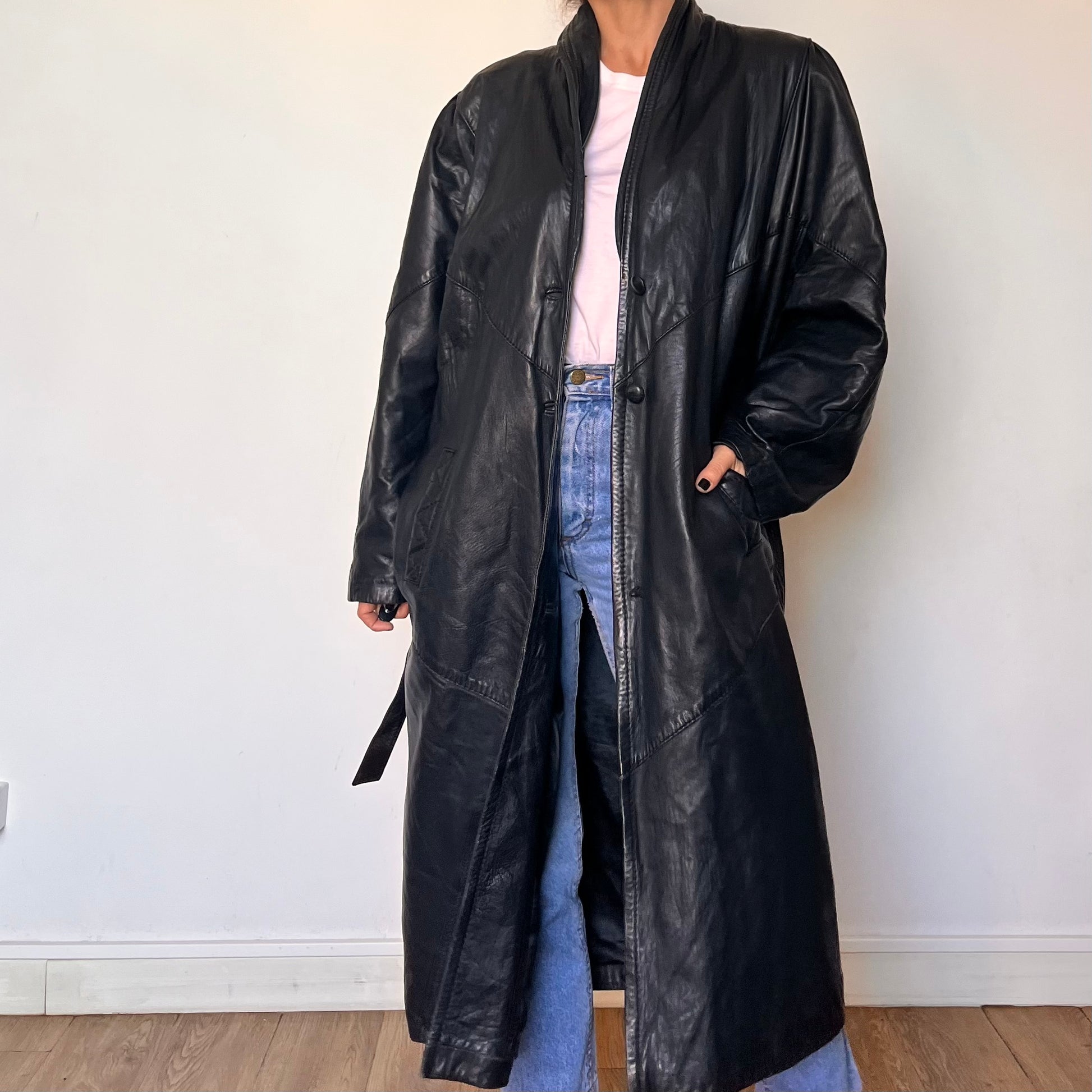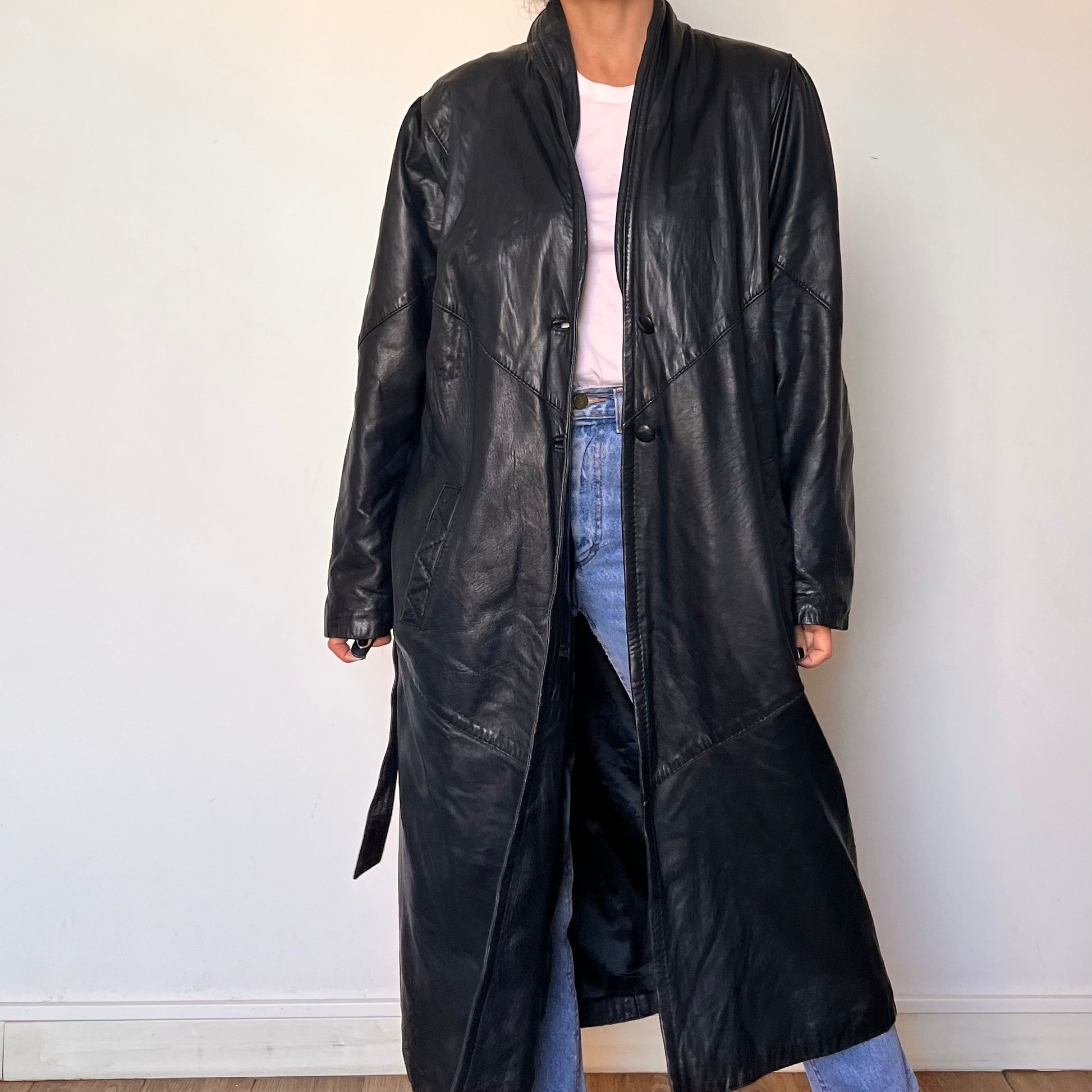 Incredible black leather overcoat with a unique design